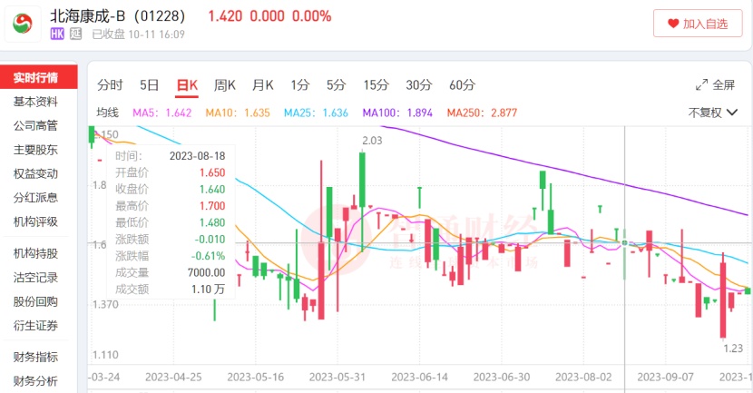 据智通财经APP了解,截至10月11日,北海康成股价仅为1.42港元,较当年上市发行价12.18港元,大幅下跌88.34%。