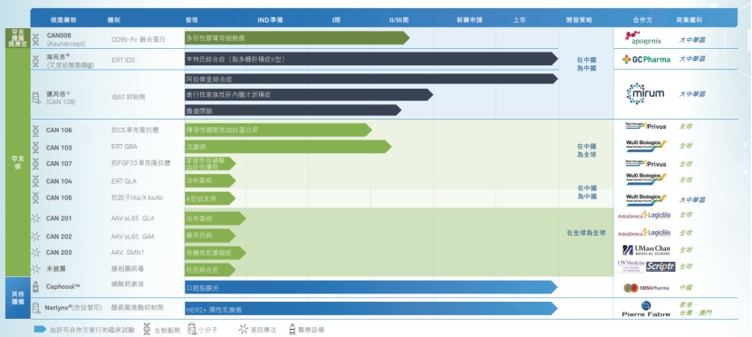 然而,当时北海康成已上市的三款产品全部依赖于license in,其中口腔含漱液康普舒™引进自英国EUSA制药公司;乳腺癌药物贺俪安®引进自美国Puma生物技术公司;罕见病用药治疗亨特综合征的海芮思®,则是引进自韩国GC制药。今年6月,北海康成的迈芮倍®获国家药监局授予上市批准,成为公司第4款上市产品。但这款产品依然是license in产品。