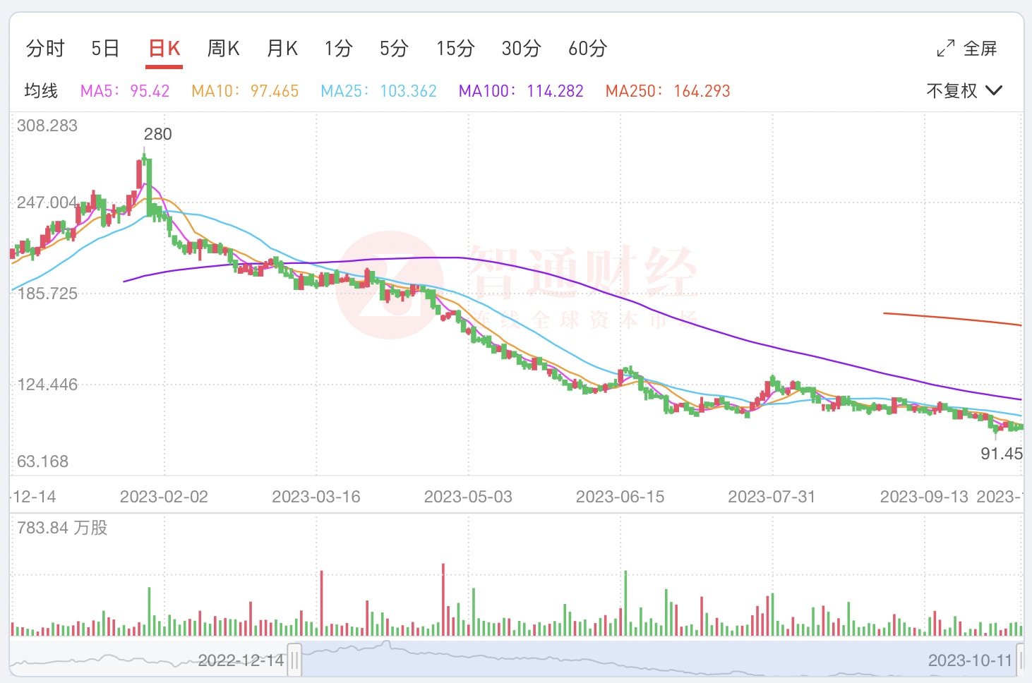 不过今年以来中国中免的股价一直都萎靡不振。以H股为例,智通财经APP观测到,自今年1月底创下上市新高后,中国中免便一直处于震荡下行之势中。10月4日公司股价更是跌至上市以来的新低水平,相较于280港元的高位水平,公司股价已跌去近七成。