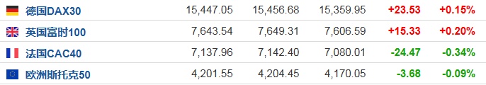 2.截至发稿,德国DAX指数涨0.15%,英国富时100指数涨0.20%,法国CAC40指数跌0.34%,欧洲斯托克50指数跌0.09%。
