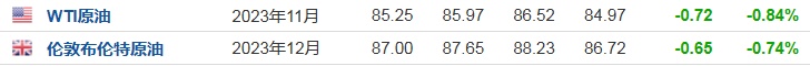 3. 截至发稿,WTI原油跌0.84%,报85.25美元/桶。布伦特原油跌0.74%,报87.00美元/桶。