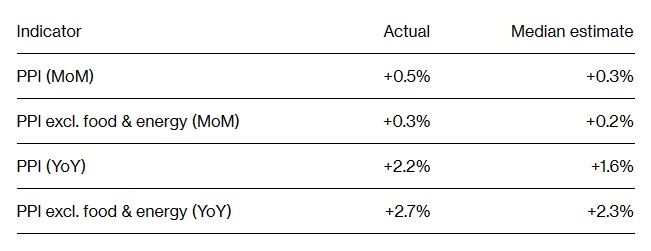 智通财经APP获悉,美国9月PPI数据全面高于预期,表明能源成本上升继续阻碍着通往可持续低通胀的道路。美国劳工统计局周三公布的数据显示,美国9月PPI同比上涨2.2%,高于市场预期的1.6%和前值1.6%;环比上涨0.5%,高于市场预期的0.3%,低于前值0.7%。另外,美国9月核心PPI同比上涨2.7%,高于市场预期的2.3%和前值2.2%;环比上涨0.3%,高于市场预期的0.2%和前值0.2%。