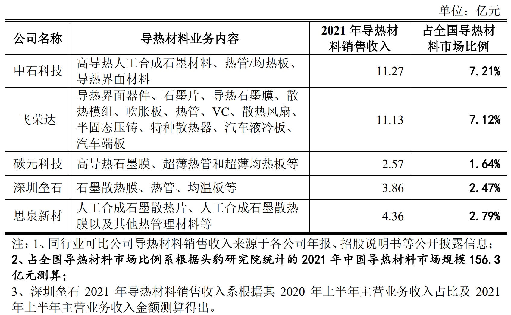 在国内导热材料市场,中石科技、碳元科技、飞荣达、深圳垒石与思泉新材的市场占有率情况如下表: