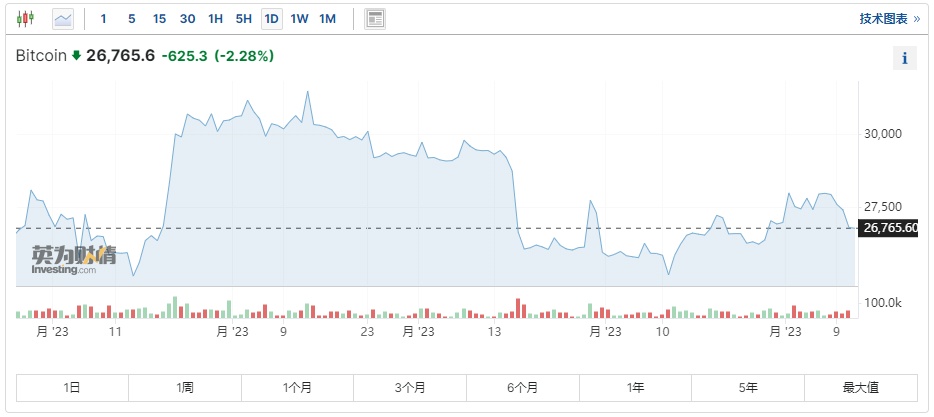 截至发稿,市值最大的数字资产比特币暴跌2.28%,至26765美元/枚,为一个月来的最大跌幅。较小的代币,如Solana和Polygon,跌幅较小。