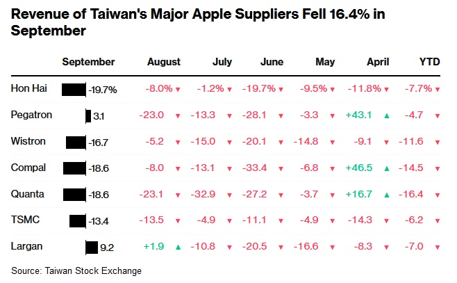 设备组装商鸿海精密、仁宝电子和广达电脑领跌,这三家公司在9月的营收分别同比下降19.7%、18.6%和18.6%。和硕(Pegatron)及专业精密光学镜片、镜头制造厂商大立光电(Largan)是唯二在9月实现营收同比增长的公司,分别同比增长了3.1%和9.2%。