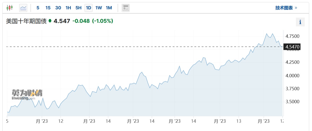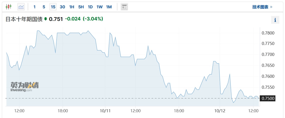 截至发稿,日本十年期国债收益率跌超2个基点,至0.751%;十年期美债收益率则跌近5个基点,至4.547%,从上周五触及的16年来高位4.89%回落。