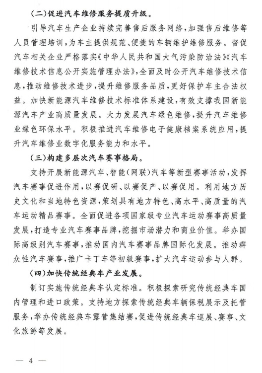 《指导意见》提出7方面政策措施。一是优化汽车配件流通环境,提出制订实施汽车后市场配件流通标准、鼓励发展连锁经营等配件流通模式,推动汽车配件流通规范、透明、高效发展。二是促进汽车维修服务提质升级,提出加快新能源汽车维修技术标准体系建设、加强售后维修培训、发展汽车绿色维修、提升汽车维修数字化服务能力,更好支撑新能源汽车产业发展和保护车主权益。三是构建多层次汽车赛事格局,支持开展新能源汽车、智能网联汽车等新型赛事活动,发展国际级、国家级汽车赛事。四是加快传统经典车产业发展,提出研究制定传统经典车国内管理和进口政策,支持地方探索传统经典车辆保税展示及托管服务。五是支持自驾车旅居车等营地建设,加强政策支持,促进房车旅游消费发展。六是丰富汽车文化体验,支持地方推进汽车博物馆和汽车影院等项目建设运营、组织开展汽车文化交流活动。七是优化汽车消费金融服务,鼓励金融机构在依法合规、风险可控的前提下,优化对汽车使用消费的金融服务。