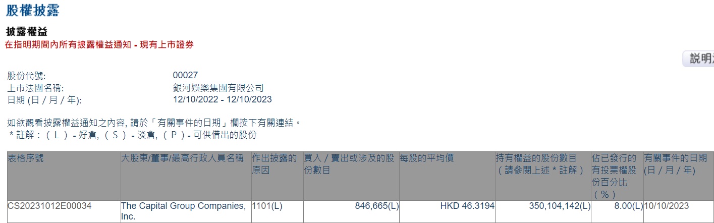 智通财经APP获悉,香港联交所最新资料显示,10月10日,美国资本集团增持银河娱乐(00027)84.6665万股,每股作价46.3194港元,总金额约为3921.70万港元。增持后最新持股数目约为3.50亿股,最新持股比例为8%。