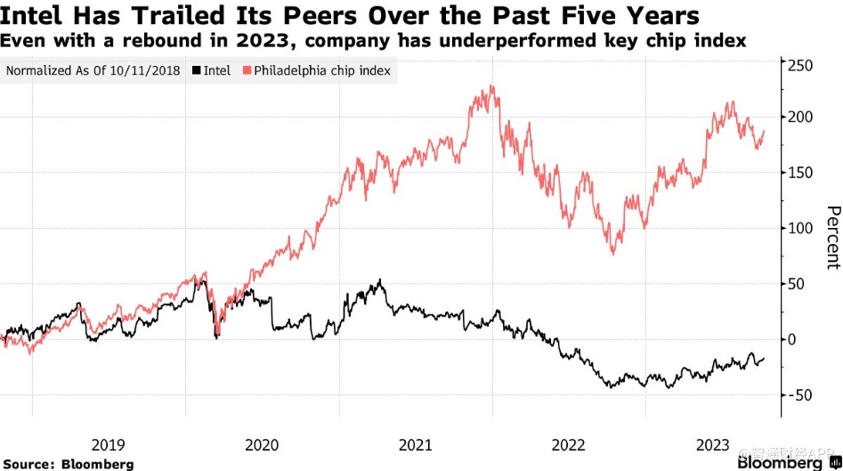 在制造方面的失误导致英特尔失去市场份额之前,这家芯片制造商已经主导了该行业数十年。英特尔目前的营收不及台积电(TSM.US)和三星电子,市值也只有英伟达的一小部分。