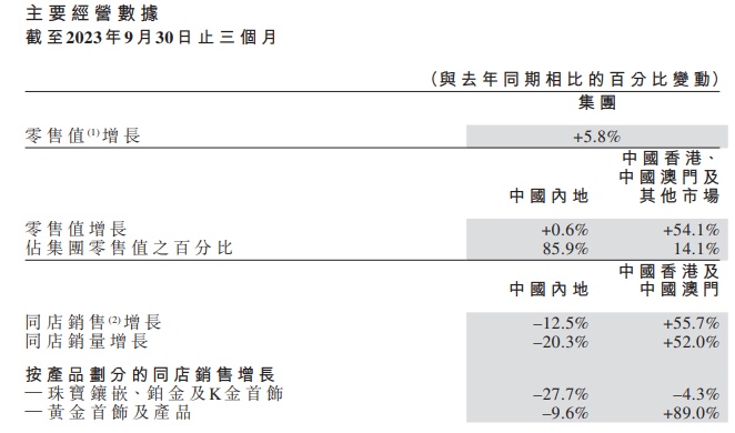 公告显示,按产品划分,内地珠宝镶嵌、铂金及K金首饰类别的同店销售下跌27.7%,零售值下跌17.9%,由於宏观环境疲弱普遍影响非必需品的购买需求,同类别在香港及澳门的同店销售则减少4.3%。内地同店平均售价增加至8200港元,香港及澳门的同店平均售价则为1.69万港元。