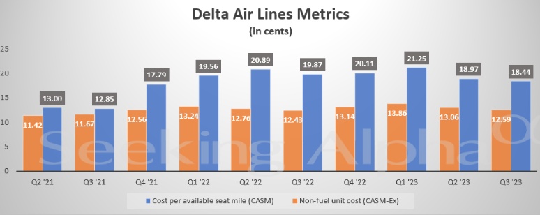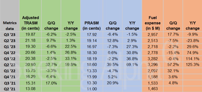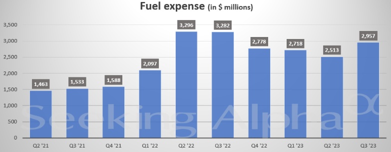 三季度,每可用座位英里的非燃料成本上升了1.3%。第三季度调整后的燃油价格为2.78美元/加仑,较上年同期下降21%,主要是由于去年俄乌战争爆发后能源价格飙升。但总燃油成本环比上升17.7%。