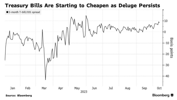 三个月期国库券和隔夜指数掉期(OIS)之间的利差奠定了市场基调。这两种利率之间的差距正在扩大,这表明投资者正在要求获得更多的补偿,以购买美国政府大量发行的债券。这给包括银行在内的所有短期借款利率带来了压力。