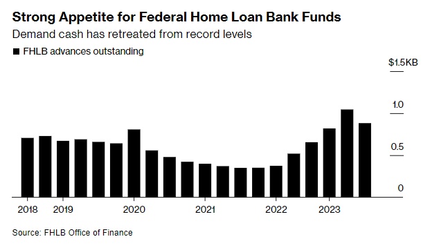 美国联邦存款保险公司(FDIC)通过所谓的预付款向商业银行和其他成员提供资金。这些预付款往往是由抵押贷款或其他资产担保的短期贷款。在3月份银行系统出现动荡之后,由于各机构呼吁提供预防性资金以增强流动性,第一季末未偿还的预付款总额飙升至逾1万亿美元的纪录高位。自那以后,这一数字有所回落,但如果银行需要增加现金储备,预付款可能仍会重新上升。
