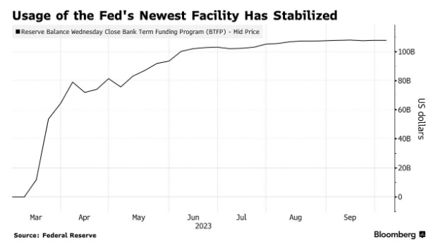 在银行出现倒闭之后,美联储曾于3月推出了银行定期融资计划(BTFP),该计划以比通常更优惠的条件向机构提供一年期贷款,目的是防止为了获得资金而贱卖政府债务。在过去的两个月里,BTFP的使用量稳定在1080亿美元左右,不过在最近的利率飙升和银行融资压力上升的情况下,需求可能会有所回升。