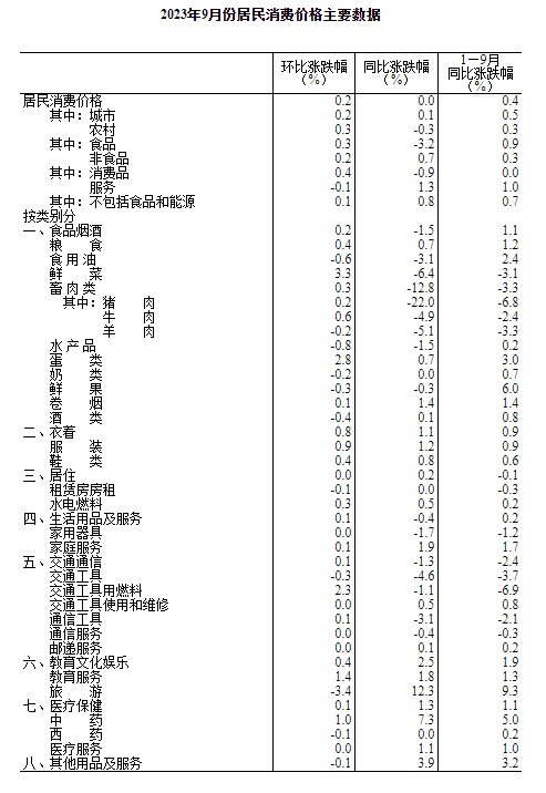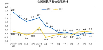 2023年9月份居民消费价格同比持平 环比上涨0.2%
