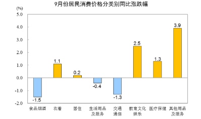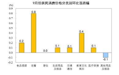 9月份,全国居民消费价格环比上涨0.2%。其中,城市上涨0.2%,农村上涨0.3%;食品价格上涨0.3%,非食品价格上涨0.2%;消费品价格上涨0.4%,服务价格下降0.1%。