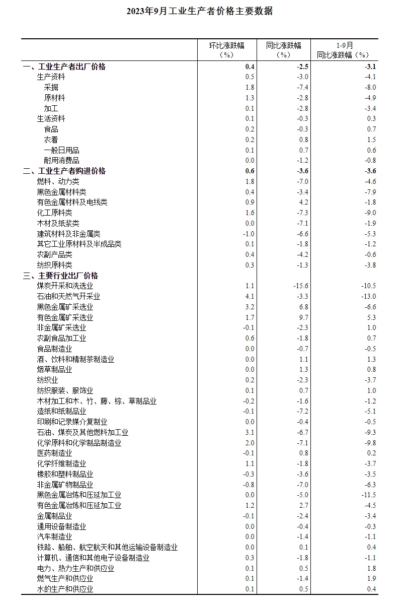 2023年9月份,全国工业生产者出厂价格同比下降2.5%,环比上涨0.4%;工业生产者购进价格同比下降3.6%,环比上涨0.6%。1—9月平均,工业生产者出厂价格比上年同期下降3.1%,工业生产者购进价格下降3.6%。