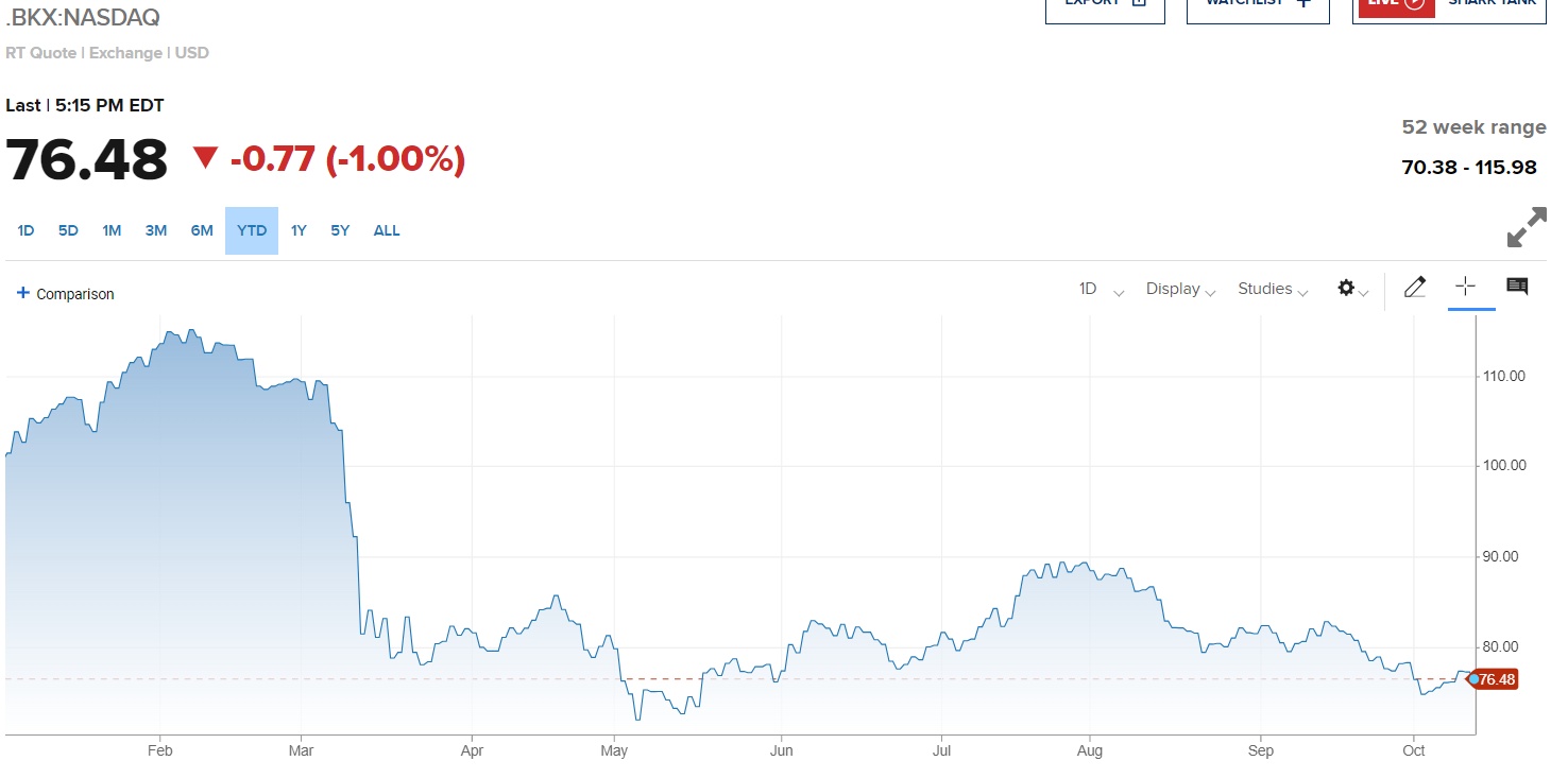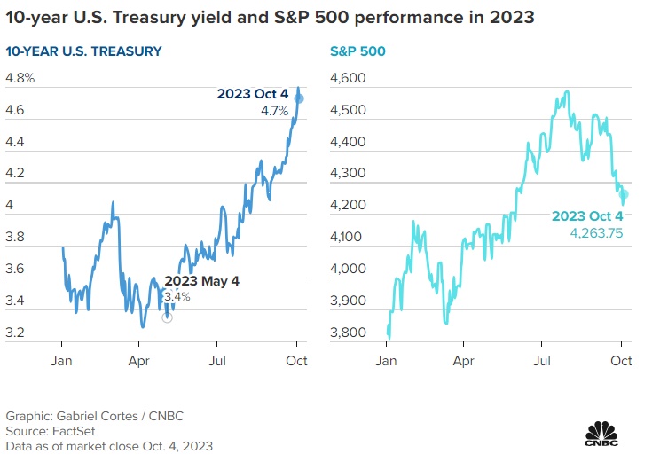 今年以来,美国银行股与美国基准利率走势,以及长期限美债收益率密切相关。标普500指数的银行成分指数9月份下跌9.3%,原因是长期限的美债收益率(尤其是10年期美国国债收益率)意外飙升引发投资者担忧,第三季度10年期美债收益率跃升逾74个基点。