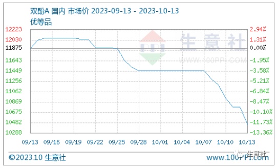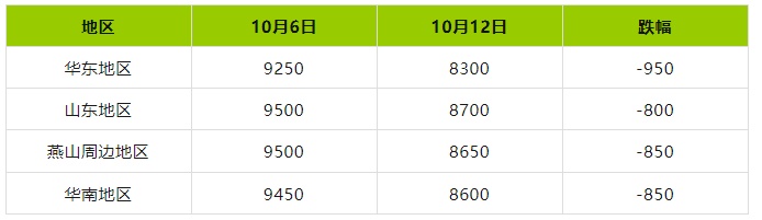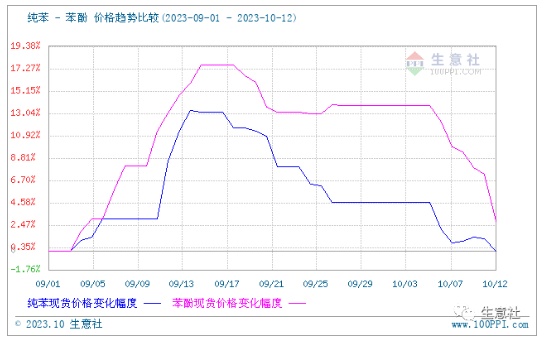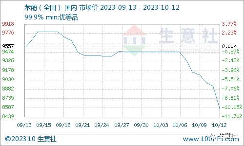 智通财经APP获悉,本周国内苯酚市场宽幅下行,节后跌幅加大。据生意社商品行情分析系统,10月6日国内苯酚市场报盘在9477元/吨,10月12日市场下跌至8562.5元/吨,跌幅9.65%,其中华东市场商谈价格跌至8300-8350元/吨。