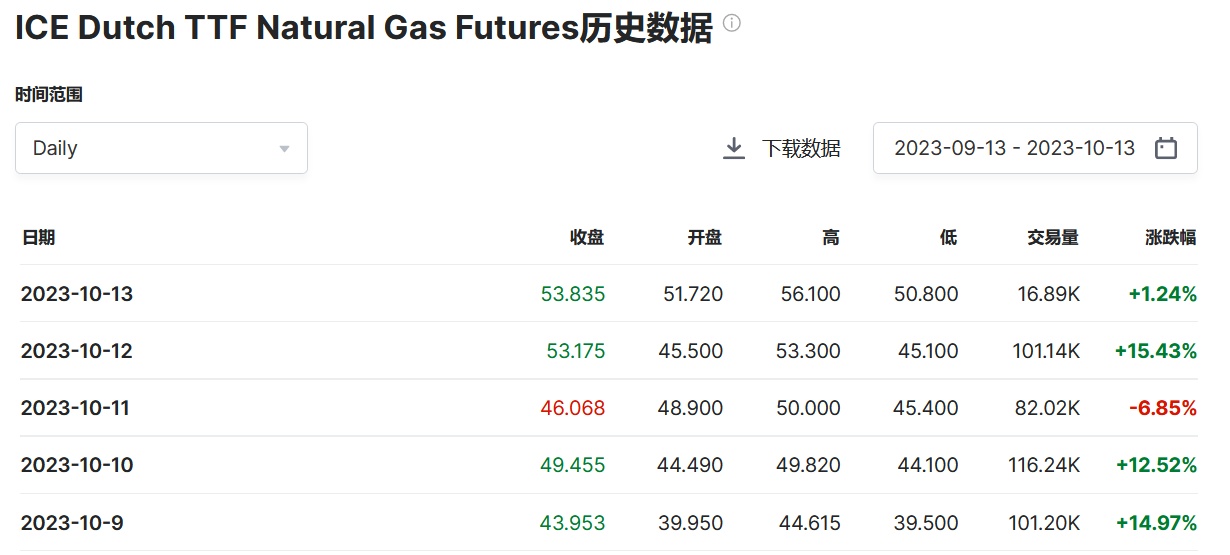 欧洲基准荷兰TTF天然气期货价格本周以来已飙涨超40%,原因是市场担心巴以冲突有可能令中东地区卷入其中,而中东地区是主要天然气出口国(如卡塔尔)和贸易要冲之地。与此同时,雪佛龙(CVX.US)与澳洲液化天然气工厂工会之间的谈判也惹人关注,谈判进展将决定工会是否将于下周开始罢工。