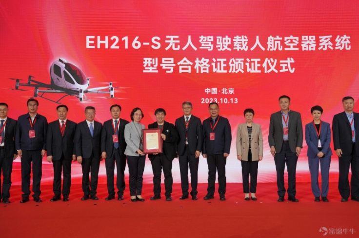 10月13日,EH216-S无人驾驶载人航空器系统型号合格证颁证仪式在北京民航国际会议中心隆重举行,中国民航局向亿航智能正式颁发EH216-S无人驾驶载人航空器系统型号合格证。