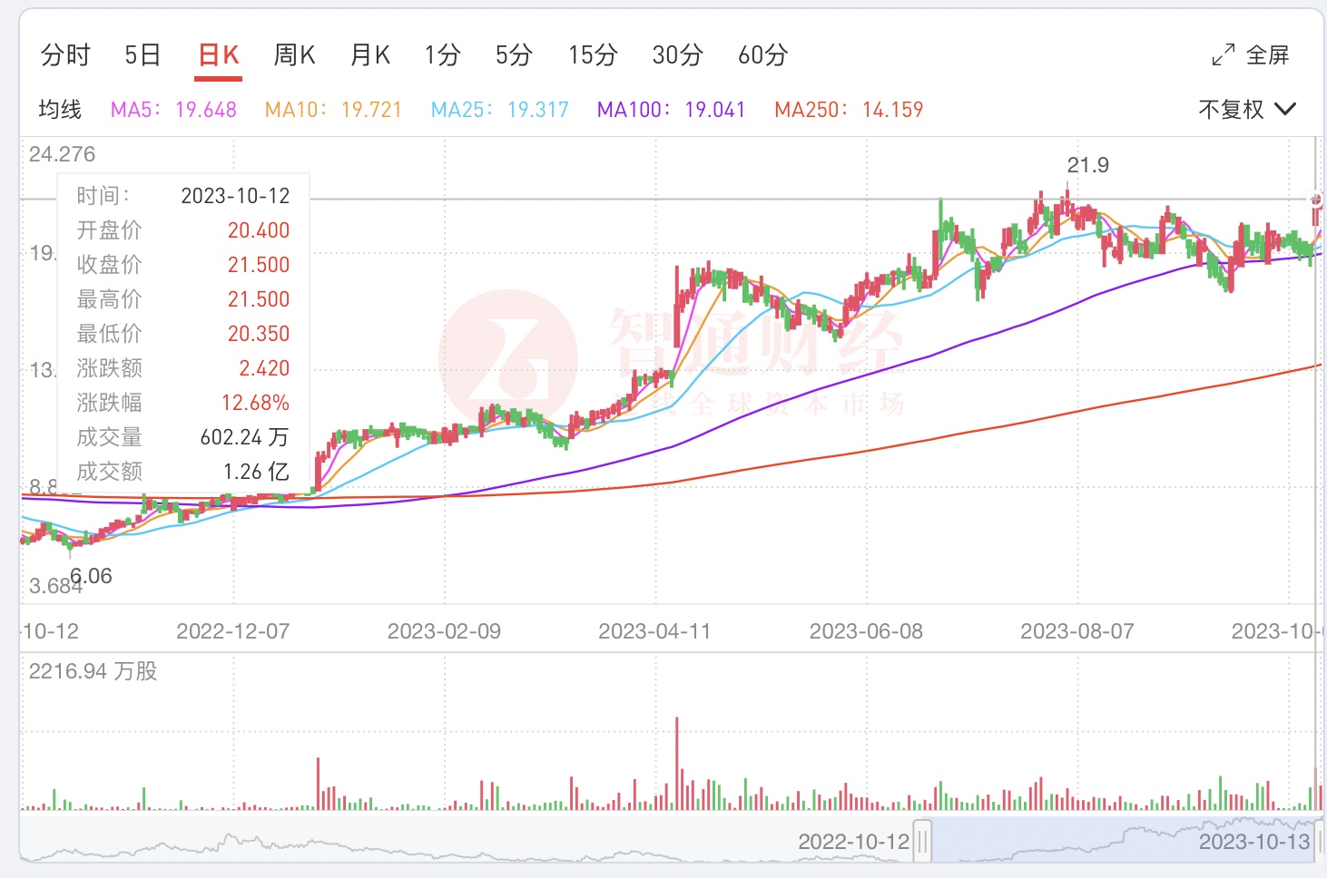 业绩盈喜发布后,次日海信家电股价应声上扬。10月12日,公司股价高开高走,反复上行,最终收报21.5元(港元,下同),全日大涨12.68%,创下近两个月的新高水平。若拉长时间线来看,2023年以来,公司股价已累涨超150%。