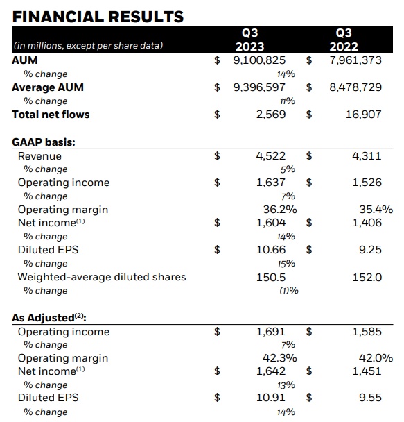 智通财经APP获悉,10月13日美股盘前,全球资产管理巨头贝莱德(BLK.US)公布了2023年第三季度财务业绩。财报显示,贝莱德Q3总营收为45.22亿美元,同比增长5%。净利润为16.04亿美元,同比增长14%;调整后的净利润为16.42亿美元,同比增长13%。摊薄后每股收益为10.66美元,上年同期为9.25美元;调整后的每股收益为10.91美元,好于市场预期的8.20美元,上年同期为9.55美元。