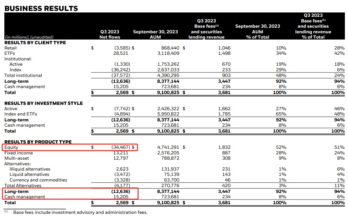 按业务划分,Q3投资咨询、管理费用及证券借贷总营收为36.81亿美元,上年同期为35.31亿美元,同比增长4%;投资顾问绩效费为7000万美元,上年同期为8200万美元,同比下降15%;技术服务营收4.07亿美元,上年同期为3.38亿美元,同比增长20%;分销费为3.21亿美元,上年同期为3.25亿美元,基本持平;咨询及其他营收为4300万美元,上年同期为3500万美元,同比增长23%。