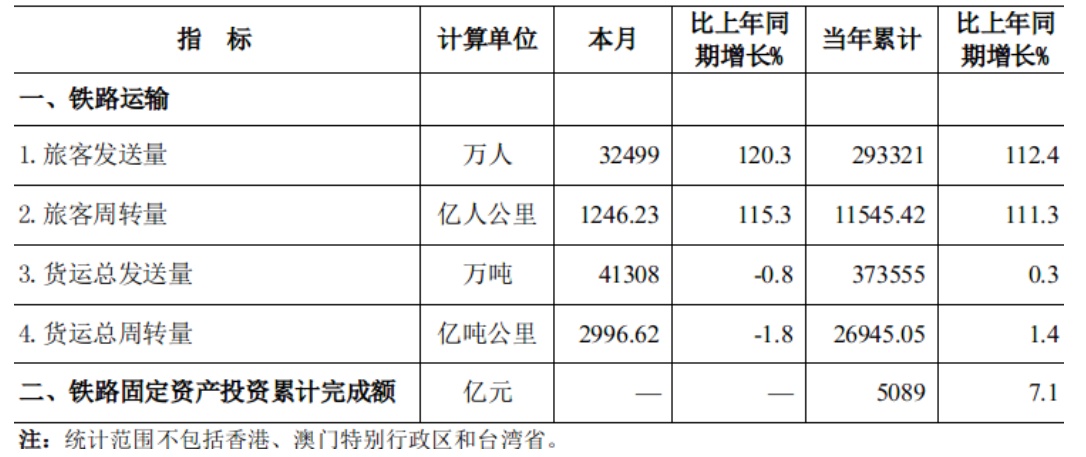 智通财经APP获悉,10月13日,国家铁路局披露2023年9月份全国铁路主要指标完成情况,9月全国铁路旅客发送量约3.25亿人,同比增长120.3%。铁路固定资产投资累计完成5089亿元,同比增长7.1%。