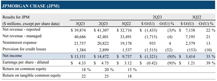 智通财经APP获悉,摩根大通(JPM.US)公布了第三季度财务业绩。数据显示,Q3营收为398.7亿美元,同比增长21.9%,较市场预期高4.7亿美元。每股收益为4.33美元,上年同期为3.12美元,较市场预期高0.39美元。净利润131.51亿美元,同比增长35%。总的来看,摩根大通公布了又一个创纪录的季度净利息收入,并上调了今年盈利指引,这得益于利率上升、信贷损失减少和收购第一共和银行。