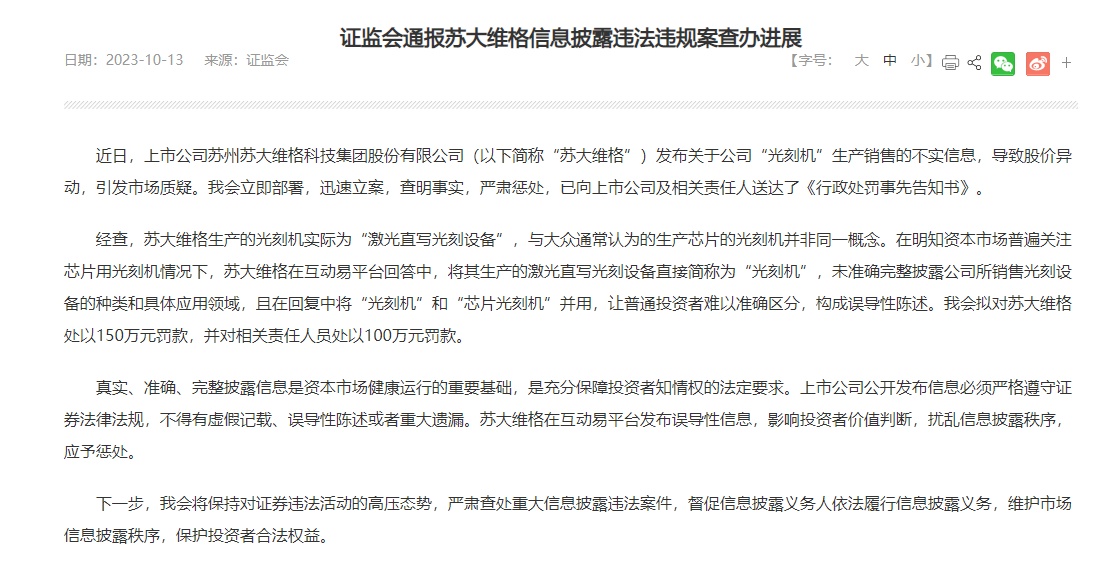 智通财经APP获悉,10月13日,证监会通报苏大维格(300331.SZ)信息披露违法违规案查办进展。经查,苏大维格生产的光刻机实际为“激光直写光刻设备”,与大众通常认为的生产芯片的光刻机并非同一概念。在明知资本市场普遍关注芯片用光刻机情况下,苏大维格在互动易平台回答中,将其生产的激光直写光刻设备直接简称为“光刻机”,未准确完整披露公司所销售光刻设备的种类和具体应用领域,且在回复中将“光刻机”和“芯片光刻机”并用,让普通投资者难以准确区分,构成误导性陈述。证监会拟对苏大维格处以150万元罚款,并对相关责任人员处以100万元罚款。