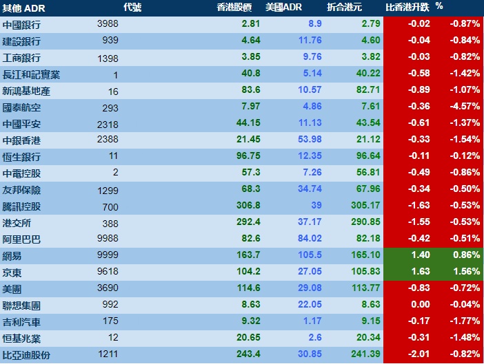 智通财经APP获悉,周五美股三大指数涨跌不一,港股ADR指数下跌,按比例计算,收报17691点,较香港收市跌132.43点或0.75%。