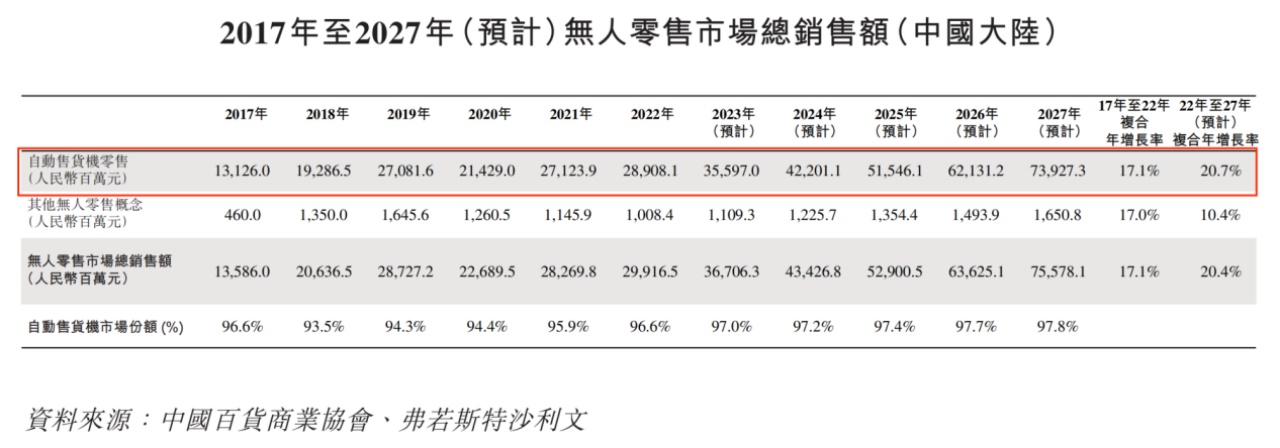 根据弗若斯特沙利文资料,中国大陆无人零售市场以自动售货机带来的零售销售价值计算的市场规模由2017年约人民币131亿元增加至2022年的人民币289亿元,复合年增长率约为17.1%,预计2022-2027年将以20.7%的复合年增长率增长,规模达人民币739亿元。