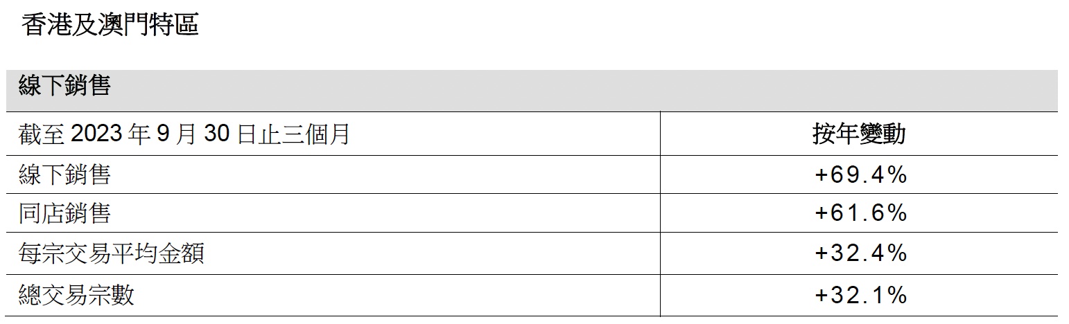 日前,莎莎国际(00178)披露了截至今年9月30日止第二财季销售数据。公告显示,7-9月期间莎莎的收入同比增加了46.2%至10.97亿港元。拆解来看,期内公司来源于线下的收入增加了50.6%至9.16亿港元,线上收入增加了27.7%至1.82亿港元。作为对比,莎莎的线下销售已恢复至疫情前的2019年3月31日止财年的47.2%的水平。