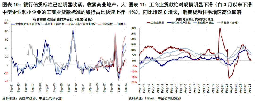 不同于政府部门,私人部门信贷继续回落。3月以来中小银行风险的暴露在刺激政府信用扩张的同时,也加快了私人信用紧缩的到来,尤其体现在中小银行更相关的间接融资:1)银行信贷标准已经明显收紧,尤其是收紧商业地产、大中型企业和小企业的工商业贷款标准的银行占比快速上行(三季度分别68.3%、50.8%和49.2%),且接近疫情初期最高点(77.5%、71.2%和70.0%);信用卡和住宅贷款的标准也有所收缩。2)工商业贷款绝对规模明显下滑(自3月以来下滑1%),同比已经转为负增长,消费贷和住宅增速高位回落。