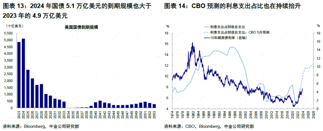 既然对当前经济周期判断而言信用比货币更重要、而私人信用收缩在高利率下又是大概率事件,那么财政就成为趋势判断的最主要依据。在当前债务偿付压力较大、大选临近两党博弈影响下,这也将是影响经济和通胀走势的核心因素。