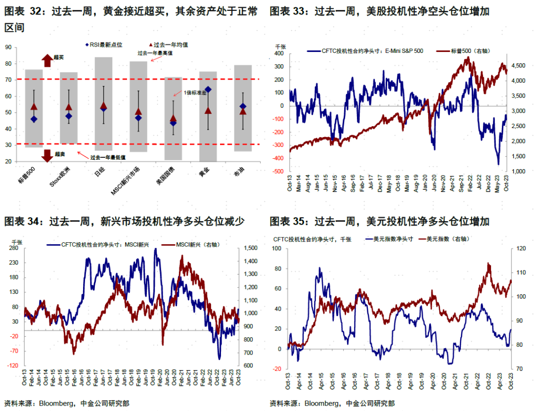 情绪仓位:黄金接近超买。过去一周,超买超卖情绪上,黄金接近超买,其他资产位于正常区间。投机性仓位方面,美股投机性净空头仓位增加,新兴市场投机性净多头仓位减少,美元投机性净多头仓位增加,黄金投机性净多头仓位减少,10年美债净空头仓位增加,2年美债净空头仓位减少。