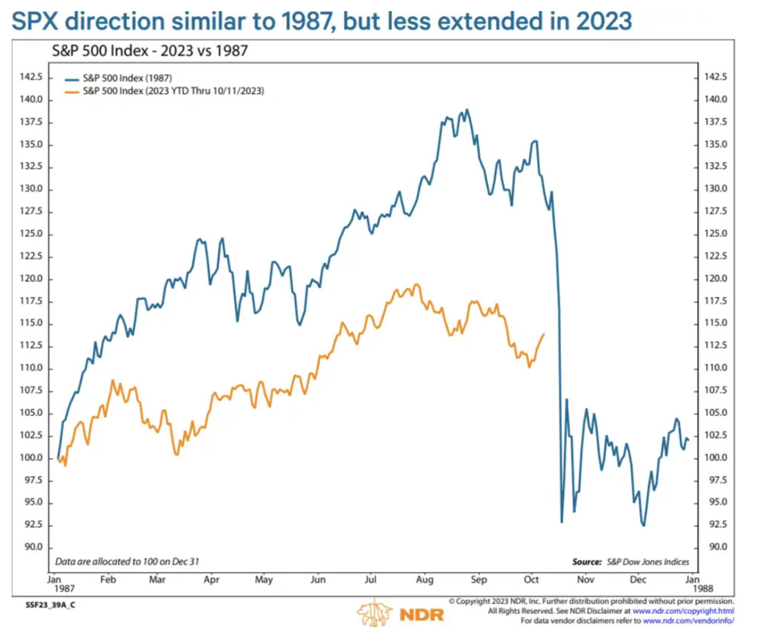 Ned Davis Research表示:“今年迄今,市值加权平均指数已录得强劲增长,但潜在市场上涨的广度一直很弱。对通胀的担忧推高了利率,引发了对进一步加息的担忧。对利率敏感的行业表现不佳。最近,美元走强,可能会阻碍企业盈利复苏。进入10月份,标普500指数从夏季高点回落了近8%。上述段落总结了2023年迄今情况。它也描述了类似1987年的情况。”