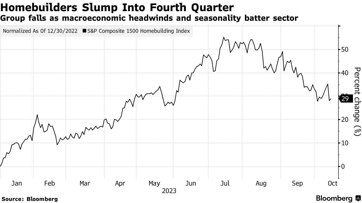 在经历今年上半年的强劲涨势之后,由于秋季美股房地产市场的典型放缓特征,叠加在美联储长时间保持高利率(higher for longer)的鹰派预期下,抵押贷款利率攀升至数十年来的高位。因此,宏观经济压力极大程度上拖累了美股整个房地产板块的股价走势,美股市场的房屋建筑商板块也难逃高利率“劫难”,难免会遭遇重大瓶颈。