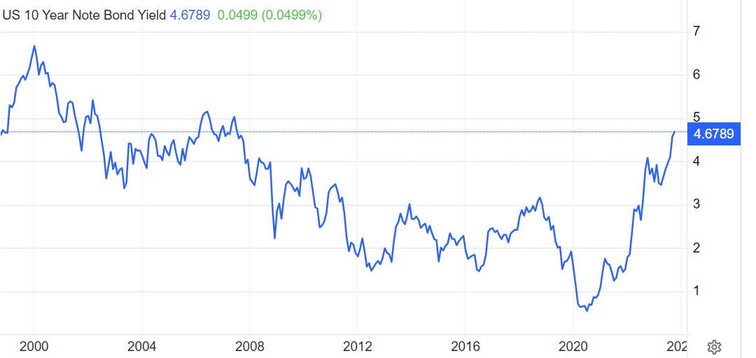 由于ISM服务业指数以及职位空缺、非农数据等多项经济数据显示美国经济韧性十足,并且实现软着陆的预期不断升温,使得金融市场愈发坚信美联储将在更长时间内维持较高利率,并且市场越来越担心中性借贷成本可能会较2008年之后的水平大幅上升。号称“无风险收益率风向标”的10年期美国国债收益率续创2007年以来新高,这在很大程度上暗示市场降息押注力度大幅减弱,取而代之的是市场预期利率水平将长期维持在较高水平。