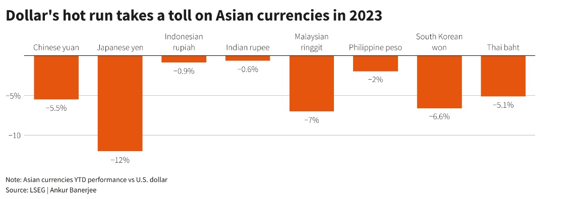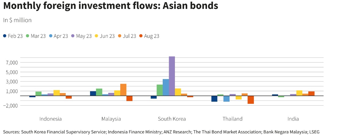 官方数据显示,8月亚洲本币债券净流出大约27亿美元,马来西亚、印尼、韩国、印度和泰国的本币债券市场录得2022年10月以来最大净流出额。此外,整个亚洲地区的外汇储备都在减少。截至9月底,韩国外汇储备为4141.2亿美元,为2022年10月以来的最低水平,而印尼的外汇储备上月降至1349亿美元,为去年11月以来的最低水平。