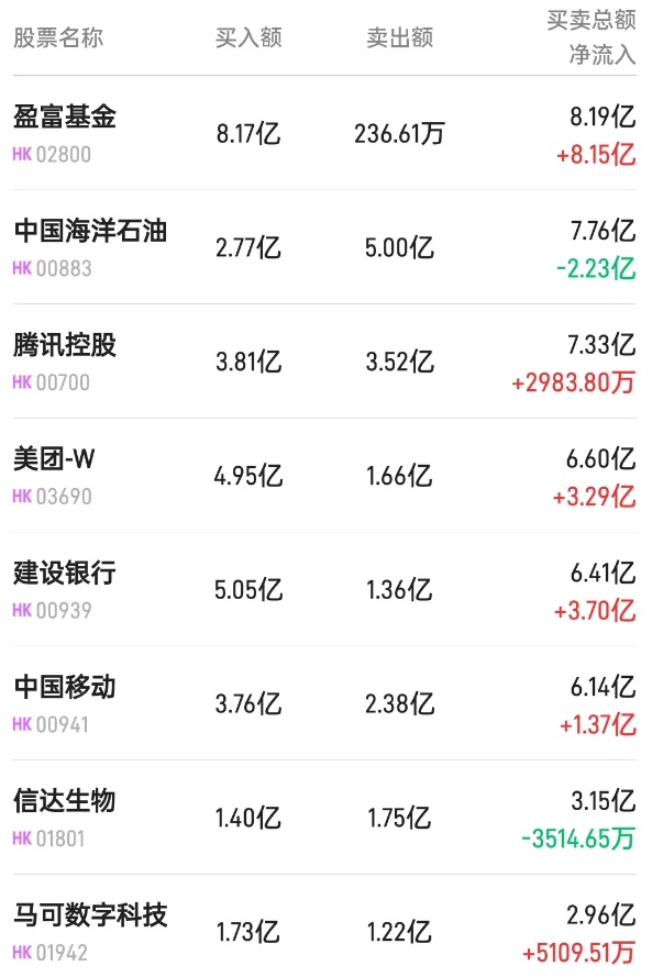 建设银行(00939)获净买入3.69亿港元。消息面上,瑞银发表报告指,中央汇金以4.75亿元人民币增持四大行A股,是八年来首次再度增持,反映政府提振市场的决心,在目前中国增长前景仍然疲弱下,相信政策决定者会进一步支持经济增长及稳定市场。该行指,虽然大型国有银行本月底公布的第三季盈利增长,可能较为疲弱,但相信股价具有韧性,目前估值已大致反映负面因素。