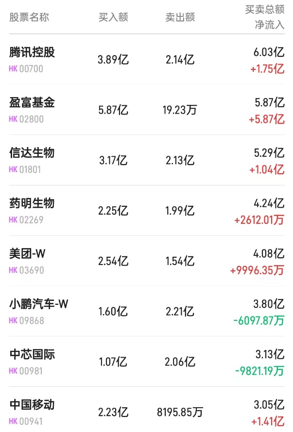 此外,中国移动(00941)、药明生物(02269)、马可数字科技(01942)分别获净买入2.78亿、1.49亿、5109万港元。而中海油(0883)遭净卖出2.1亿港元。