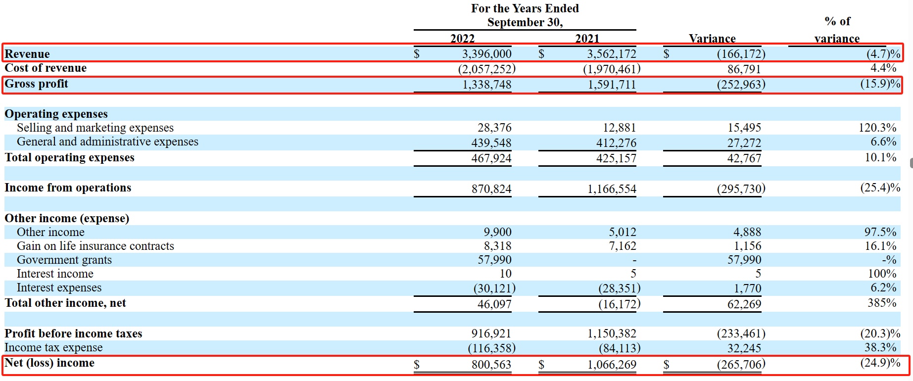 但从业绩来看,QMMM的表现不尽如人意。据招股书显示,2022财年(截至9月30日止12个月)时,公司的收入为339.6万美元,同比下滑4.7%,期内净利润为80万美元,同比下滑24.9%。详细来看,2022财年收入的下滑主要是因为疫情的影响以及来自主题公园、3D动画/阿凡达收入的减少,这也造成公司报告期内的毛利率下降5.3个百分点至39.4%。但在业务规模收缩之际,公司的总运营费用仍增长了10%,这就导致期内净利润跌幅较收入下滑幅度超20个百分点。