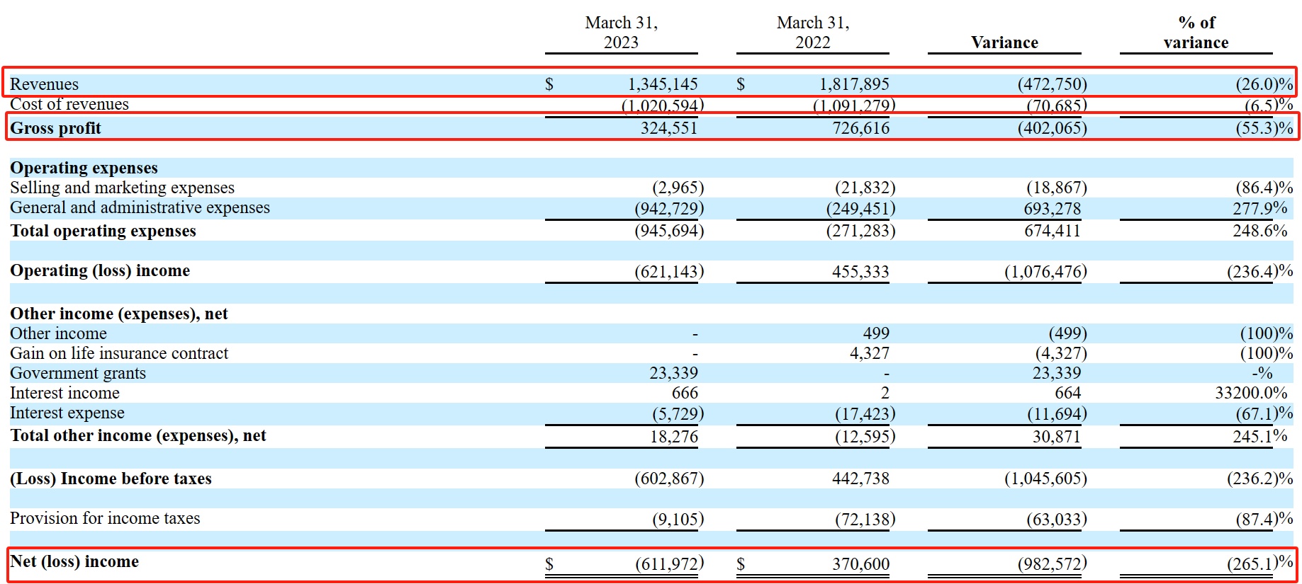 此外,QMMM负债相对较高。据招股书显示,截至2023年3月31日止,QMMM的总资产为136.79万美元,总负债为160.49万美元,资产负债率为117.33%,若剔除合同负债46.86万美元,资产负债率仍有83%。