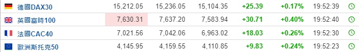 2. 截至发稿,德国DAX指数涨0.17%,英国富时100指数涨0.40%,法国CAC40指数涨0.26%,欧洲斯托克50指数涨0.24%。