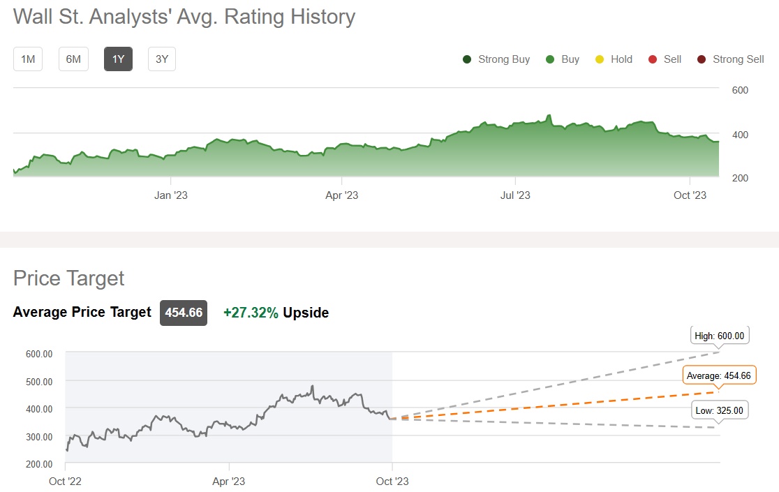 总体而言,Seeking Alpha汇编的华尔街分析师共识评级以及目标价显示,华尔街分析师们对奈飞的共识评级为“买入”,平均目标价预期则高达454.66美元,意味着未来12个月潜在上行空间高达27%。
