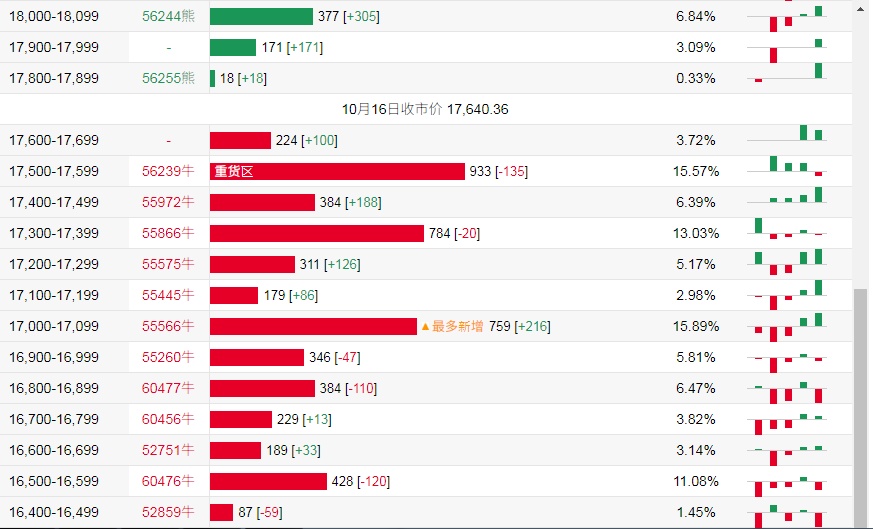 牛证街货重货区在17500-17599区间,该区间最新牛证数量为933张,较上一交易日减少135张。最多新增在17000-17099区间,该区间最新牛证数量为759张,较上一交易日增加216张。
