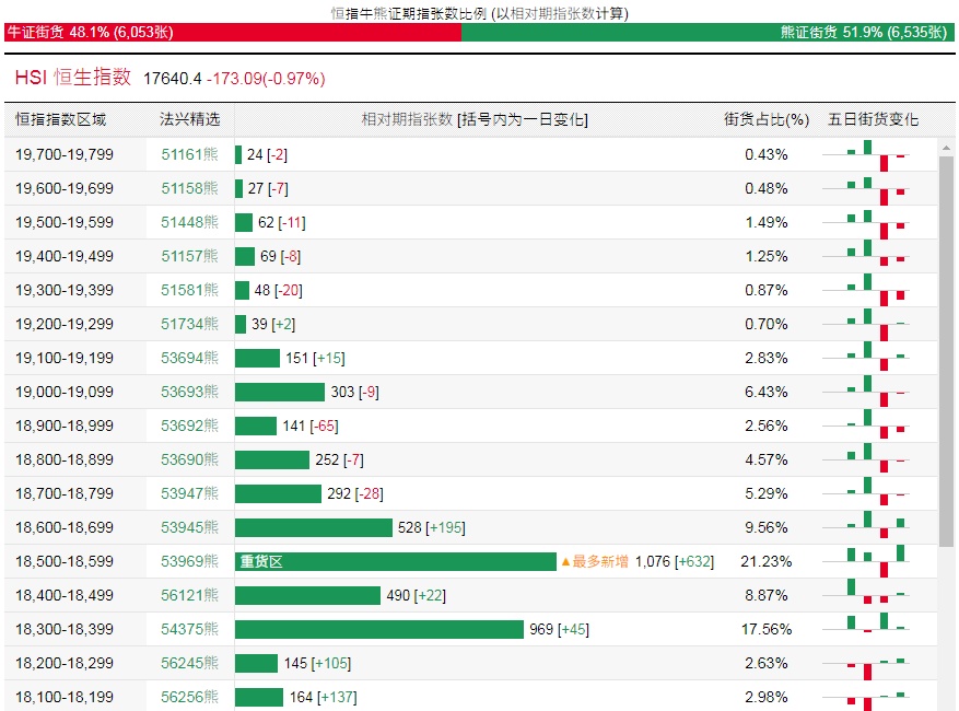 法兴恒指牛熊证街货分布图中的数据显示,熊证街货重货区和最多新增都在18500-18599区间,该区间最新熊证数量为1076张,较上一交易日增加632张。