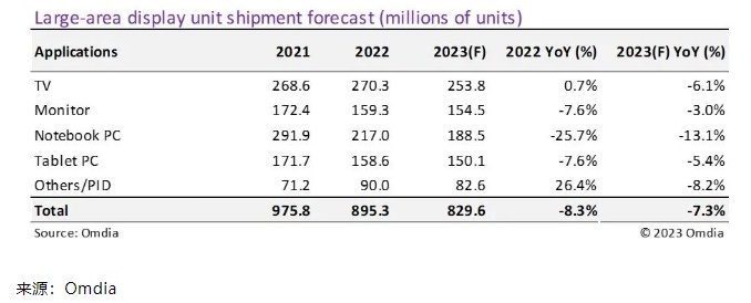 智通财经APP获悉,10月17日,Omdia此前预测表明,液晶显示屏和有机发光二极管的大尺寸显示面板的出货量,2023年同比将下降3.2%。根据Omdia最新预测,由于市场需求进一步下滑以及面板产商的产能利用管理,出货下降幅度已经进一步扩大至同年比下降7.3%。